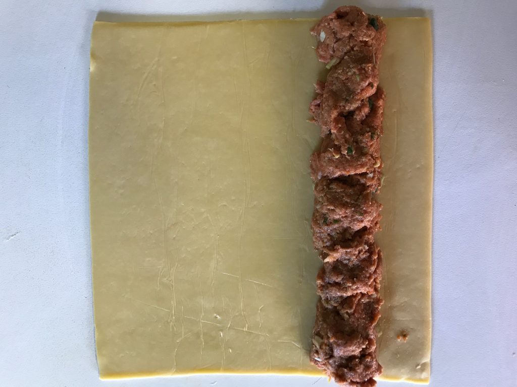 Place one sheet of pastry on the bench and put a row of the meat mixture