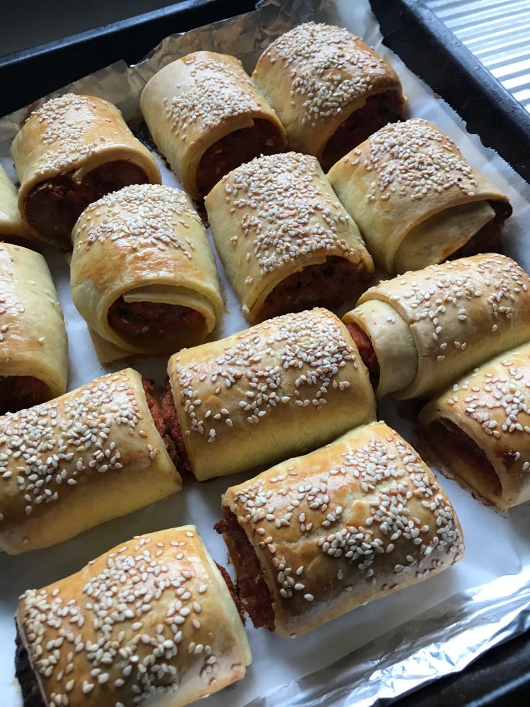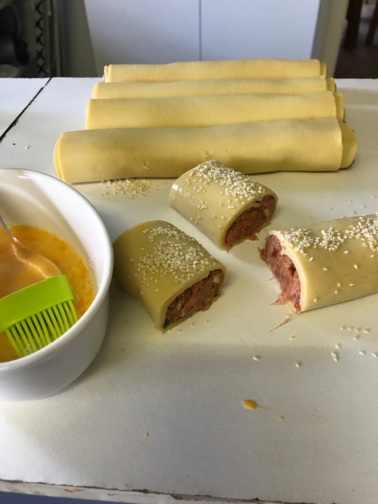 4Brush with the slightly beaten egg and top with sesame seeds. Cut into sausage rolls, I cut the roll in half and then then half again, but you might want a smaller or larger size, up to you